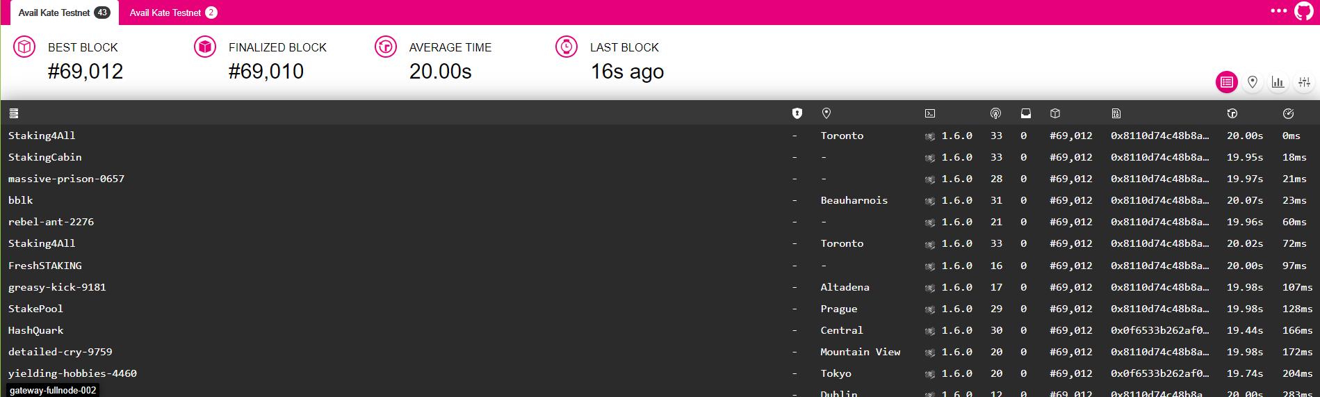 Avail project has made available a public telemetry  for anyone to view the status of their nodes. This should not replace your own monitoring and alerts. However it is a key tool that anyone can use to view the status of their nodes at anytime.