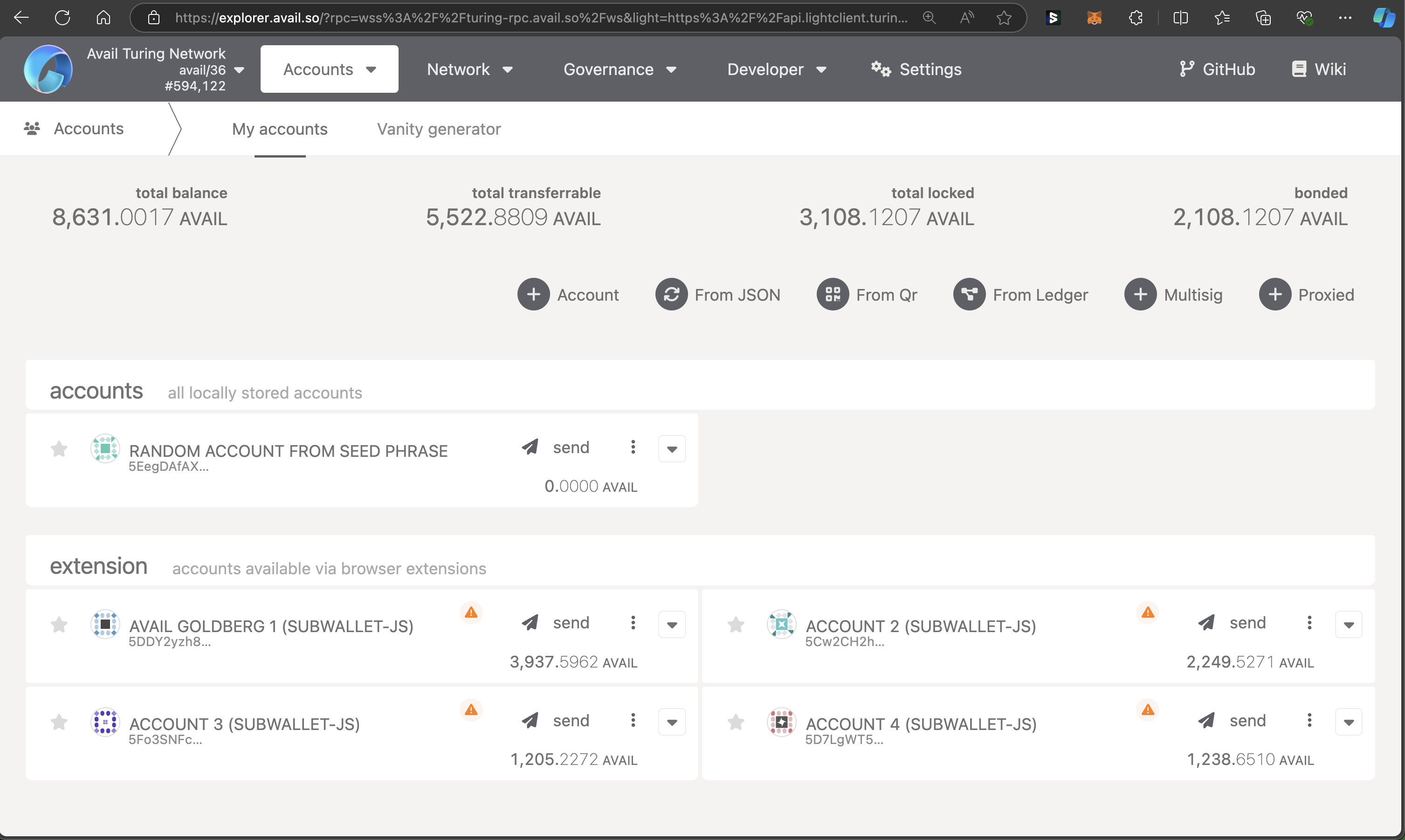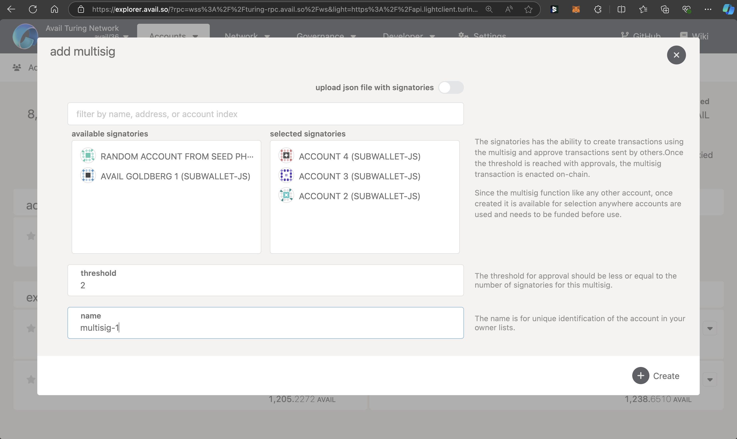Please note that a multisig account created on one network won’t be created automatically on another. This tutorial is based on he Turing testnet, but will work just as well for Avail DA mainnet too.