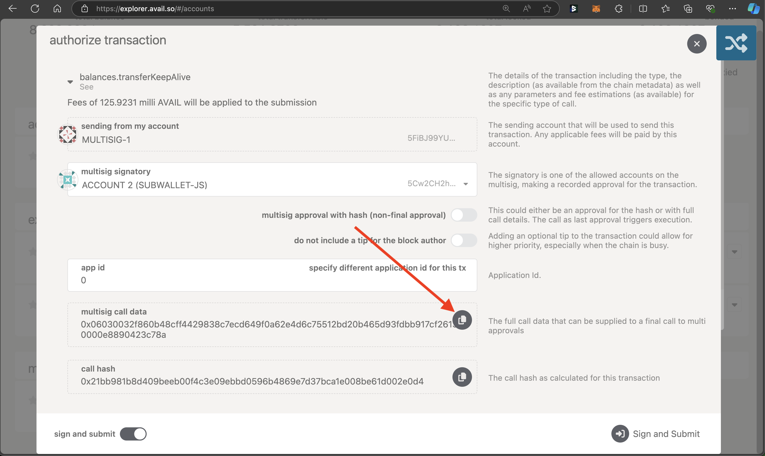 1. Copy the hexadecimal value of the multisig call data. This value will be needed later on.