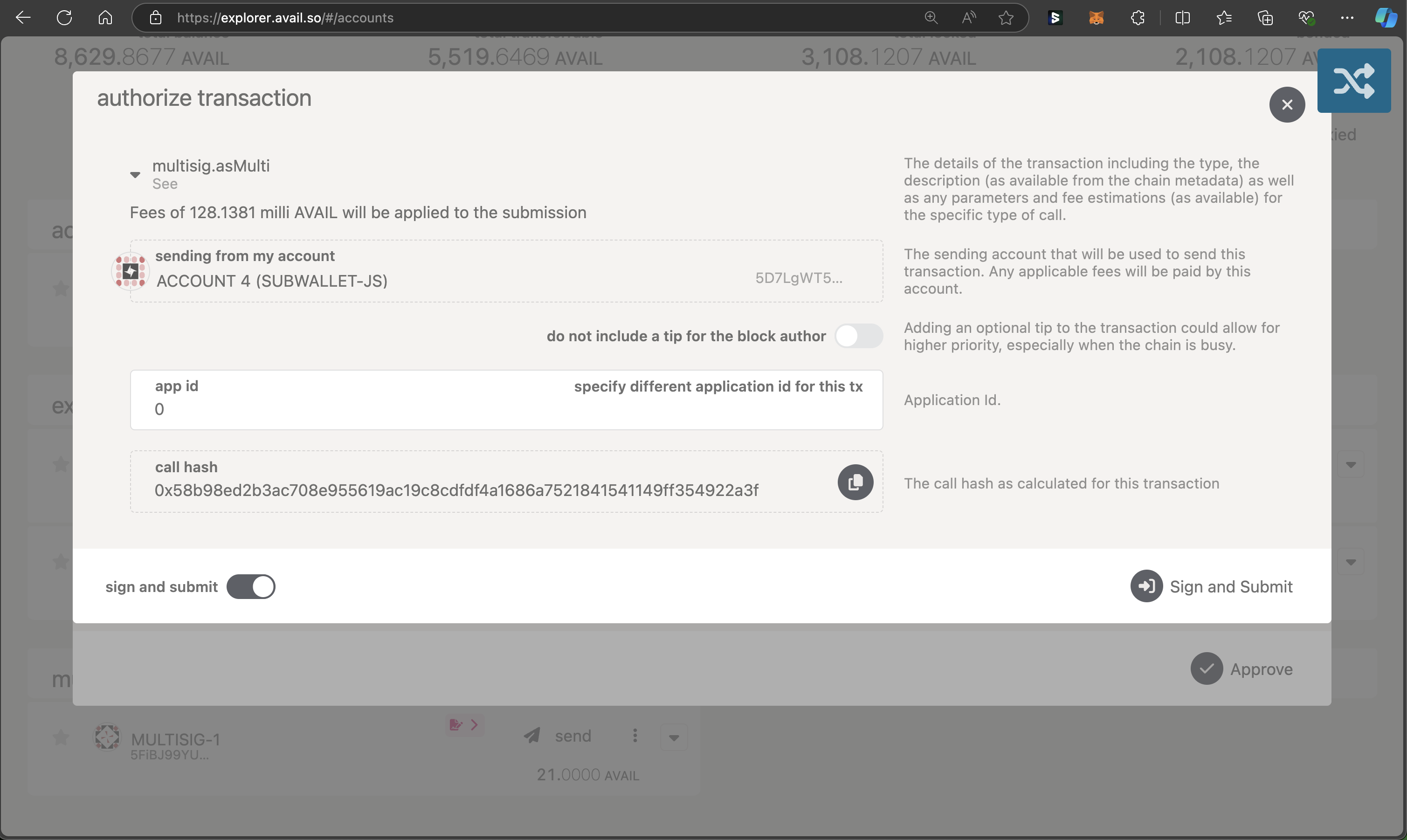 But what if you simply want to approve the transaction without executing it? Avail DA’s multisig implementation allows for this functionality too. Let us say you are the final signatory whose approval will mean the transaction has enough approvals to be executed.